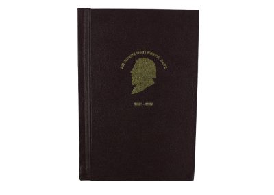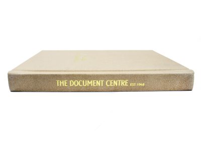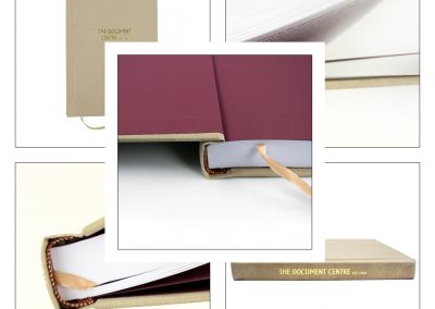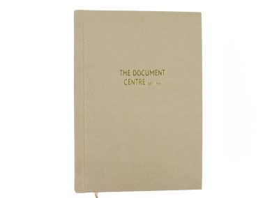 Hard Binding in Biege Recycled Leather with Gold foiling to Front and Spine with Headbands and Register Ribbon and Claret endpapers