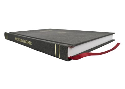 Hard Binding in Dark Recycled Leather with Gold foiling to Front and Spine with Headbands and Register Ribbon