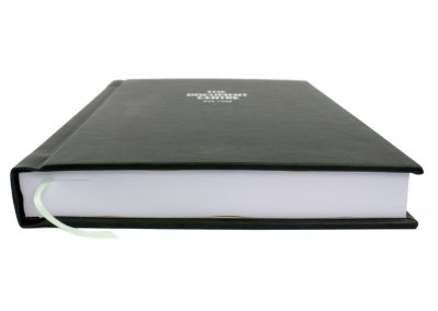 Hard Binding in Dark Recycled Leather with Gold foiling to Front and Spine with Headbands and Register Ribbon Ariel view